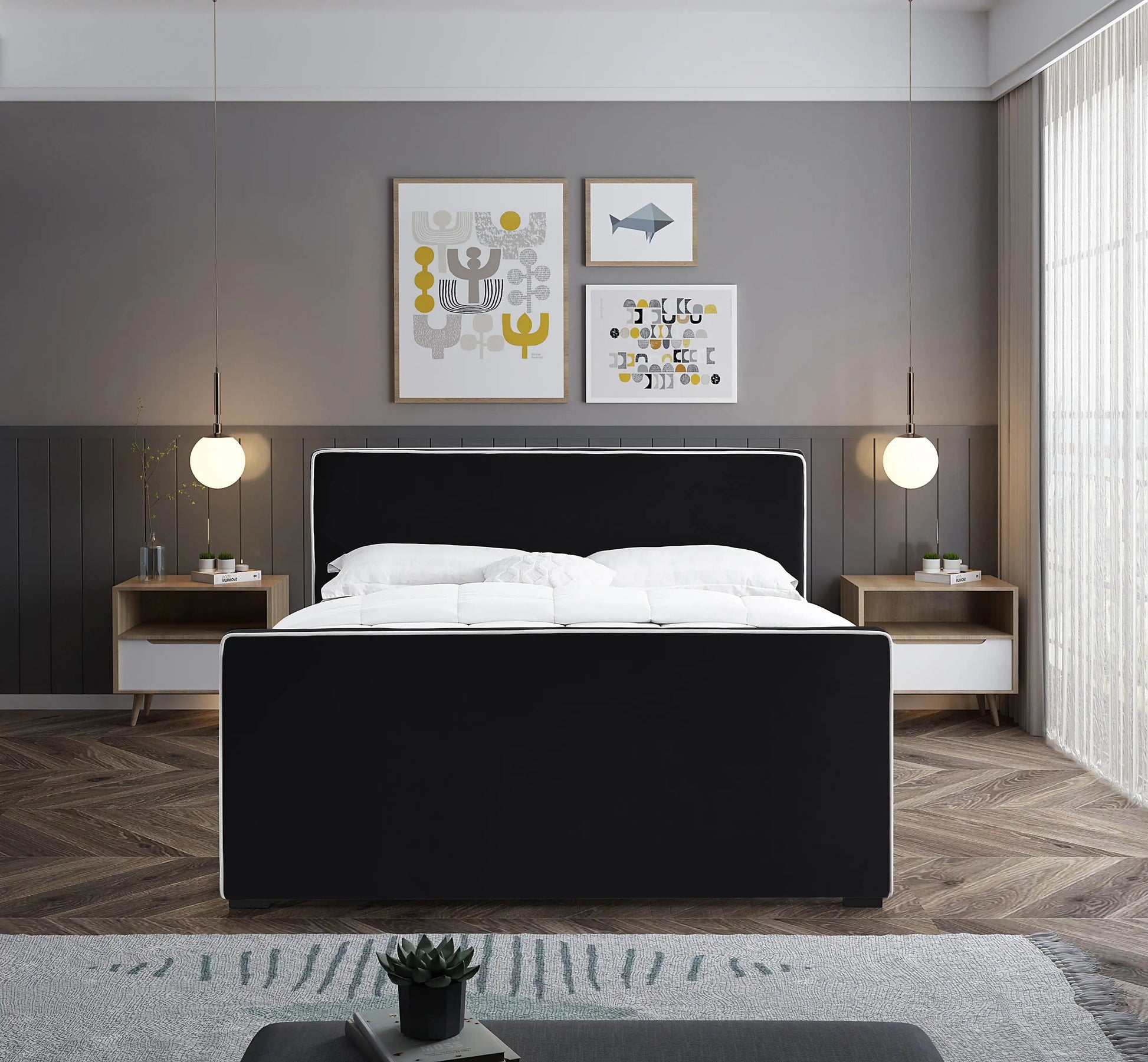 This bed frame is designed for use in a bedroom and supports a compatible mattress for sleeping.