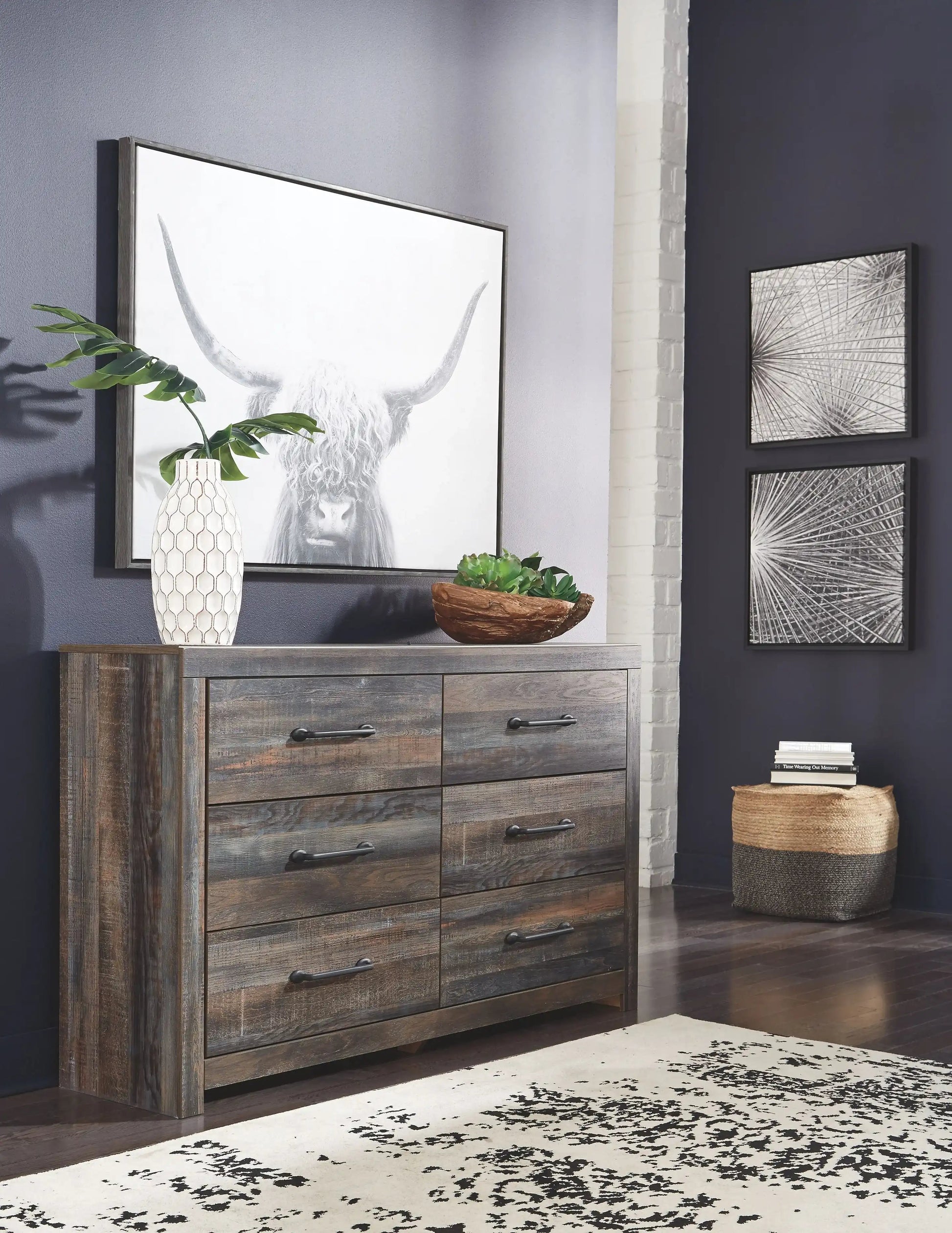 This bedroom set includes coordinated bedroom furniture pieces intended to be used together in the same room.