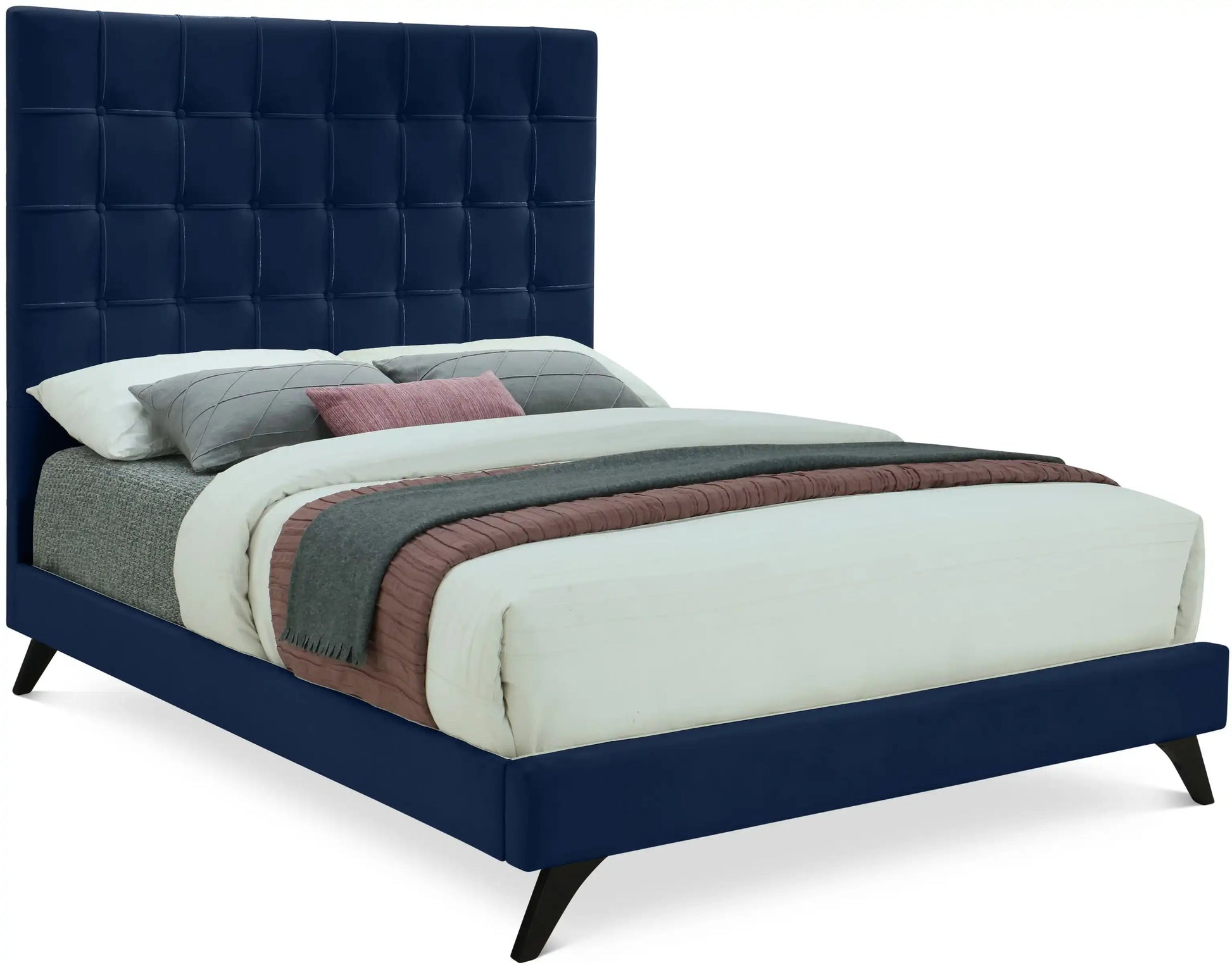 This bed frame is designed for use in a bedroom and supports a compatible mattress for sleeping.