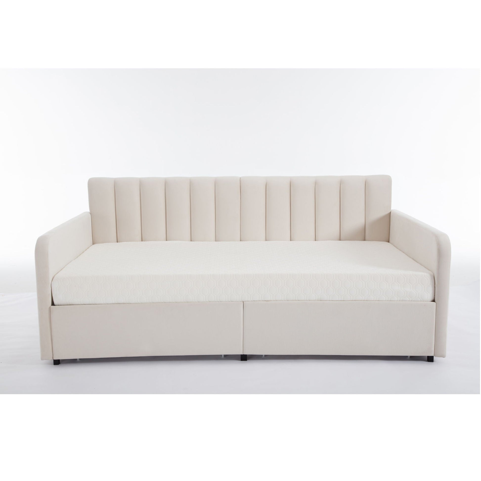 Flora - Upholstered Daybed With 2 Drawers Ribbed Tufted Backrest in Lavish Design, Twin, Beige