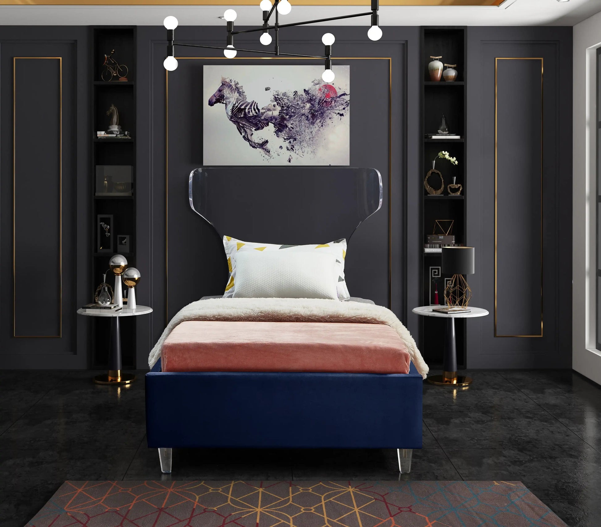 This bed frame is designed for use in a bedroom and supports a compatible mattress for sleeping.