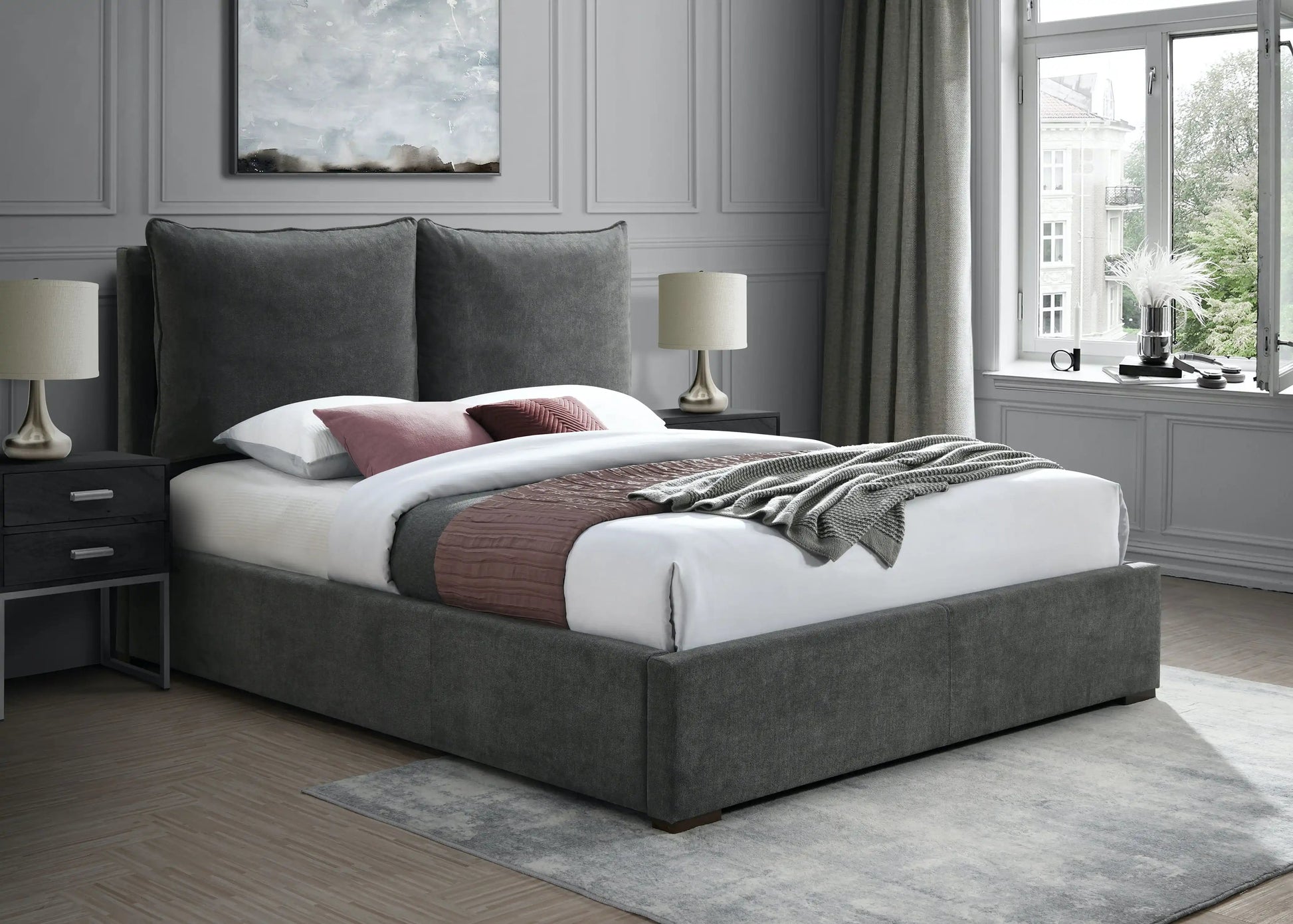 This bed frame is designed for use in a bedroom and supports a compatible mattress for sleeping.